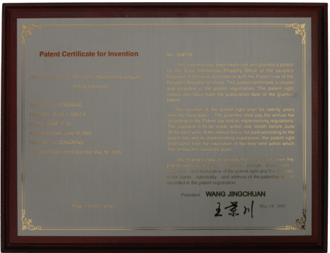 Chinese invention patent No.:03126857.9 Certificate No.:208776